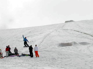 お手製のジャンプ台で遊ぶボーダー